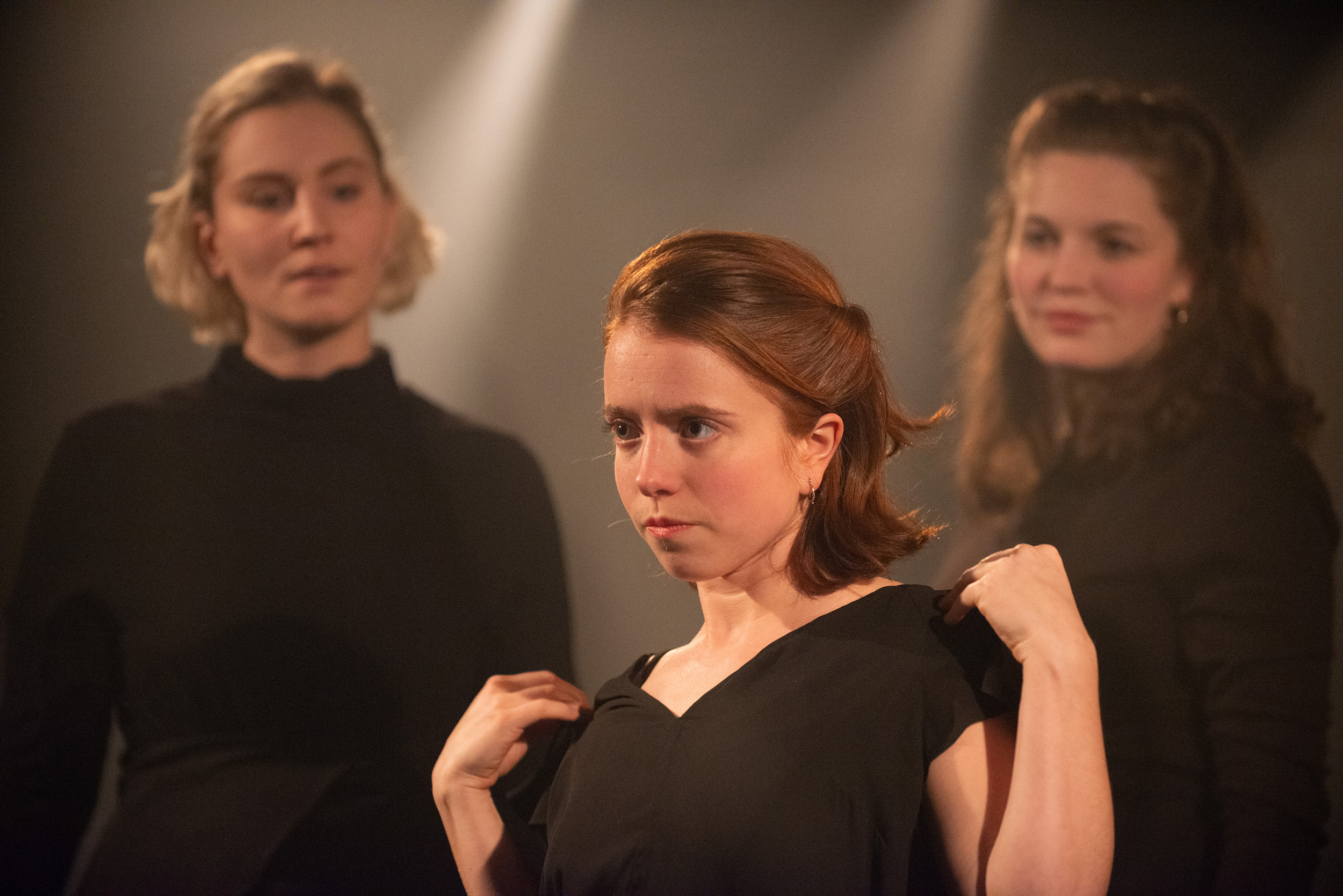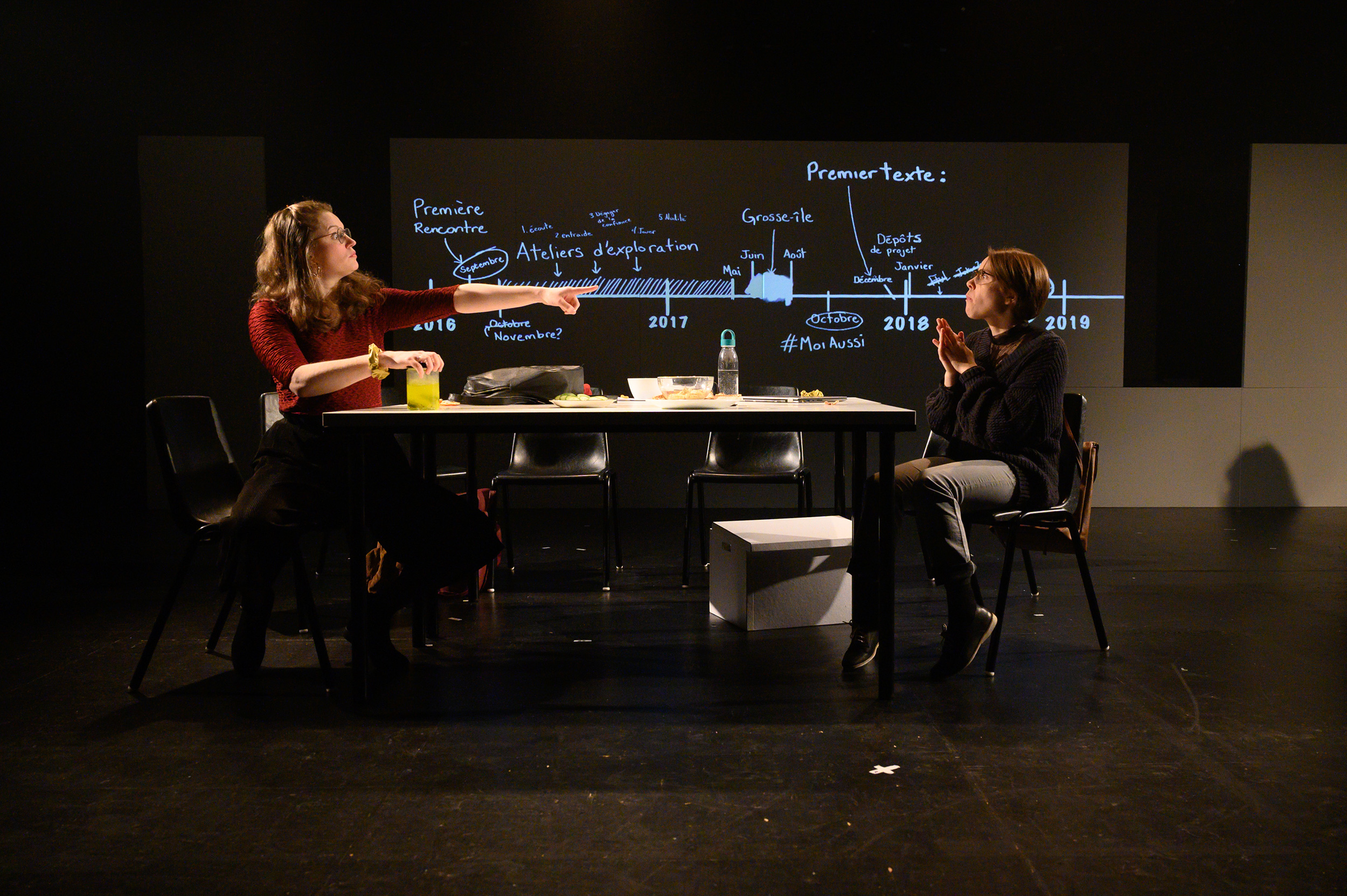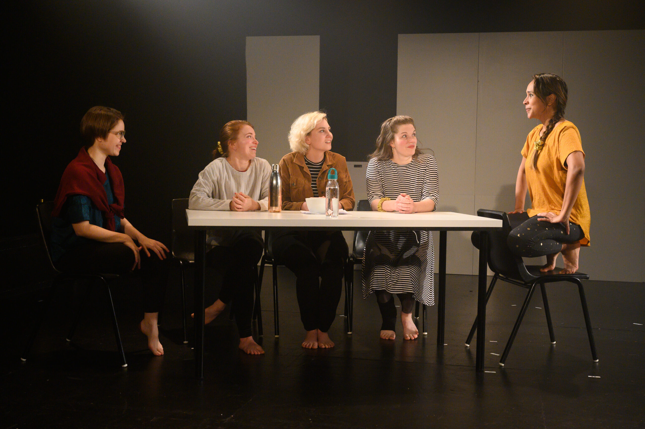 Natalie, avec cette question, espère parler de politique, mais se trouve finalement coincée dans l’intime; Marie-Ève est constamment déchirée entre la vierge et la pécheresse; Rosalie explore le radical softness et la censure des mamelons en photographie; Maude se gave d’essais féministes pour étouffer son sentiment d’impostrice; Noémie s’insurge contre la monarchie et brûle sa couronne. Elle s’empresse ensuite de lancer de l’eau sur les flammes par peur de déranger ses voisins.