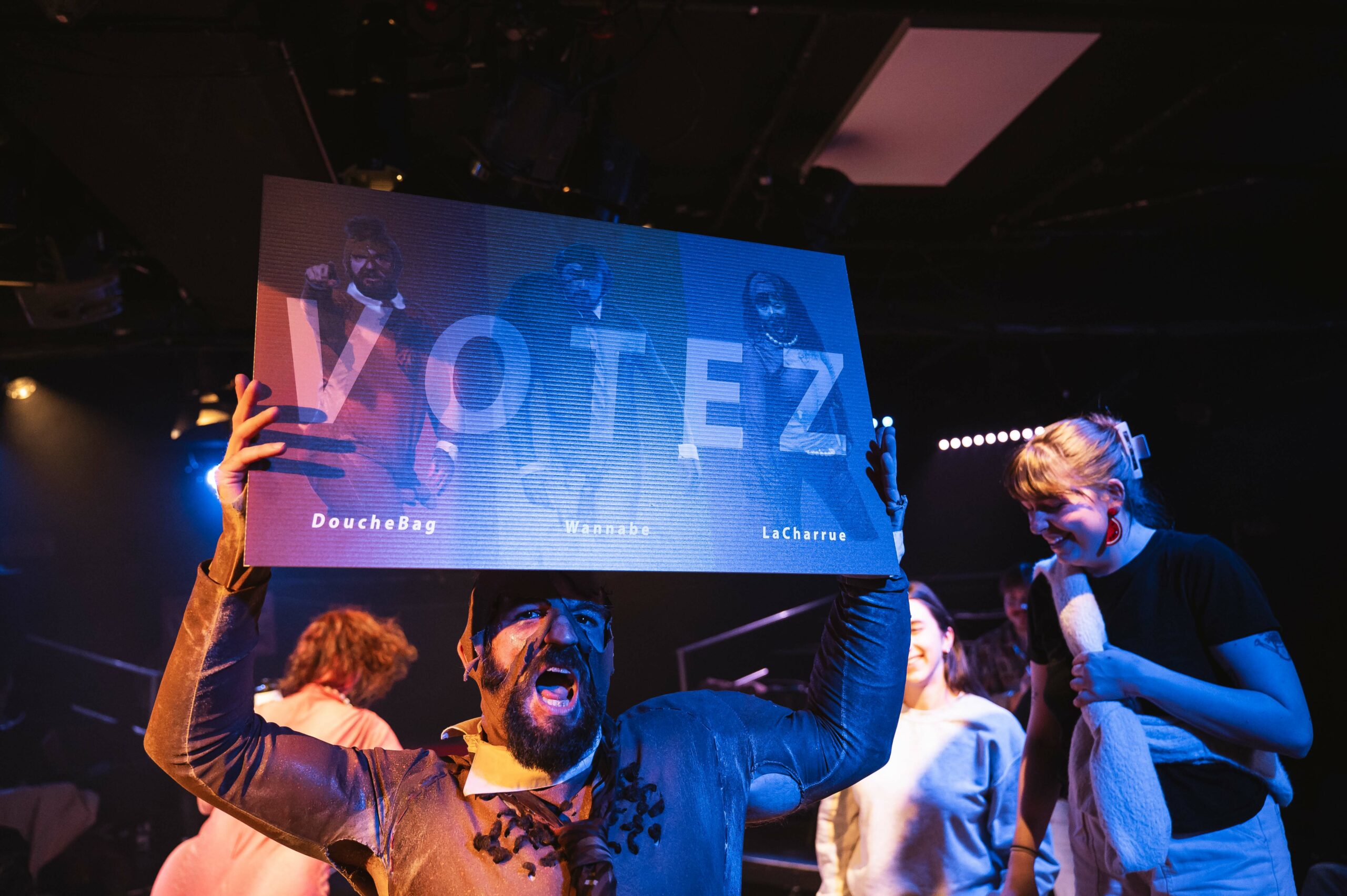Les bouffons Lacharrue, Douchebag et Wannabe jouent à un jeu dangereux : la démocratie. Venez accomplir votre devoir de citoyen·ne et participez aux élections ! Le Parti du Gros Bon Sens, les Enverdeurs et le Parti lobbyiste patriotique se disputent votre faveur dans une campagne de salissage aux proportions démesurées. Peu importe le résultat, vous pourrez enfin proclamer sans mentir : « Nos élus sont des bouffons ! »